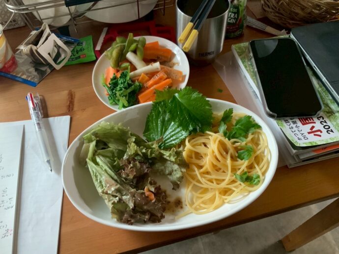 昼食メニューの写真です。豊かさを感じます。にんじんの葉っぱや大根の葉も美味しく味わって頂いています。一人ではとても使いきれませんけれど・・・