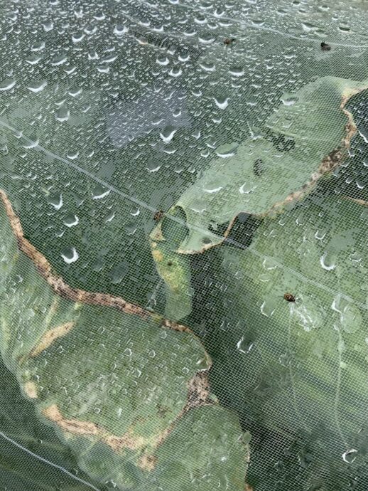 なので、防虫ネットという資材を使った区別がなければ、このシェア農園のきゃべつも、あっという間に食い尽くされてしまっていたかもしれません。そう思わせるほど、たくさんのカメムシがネットに貼りついていました。